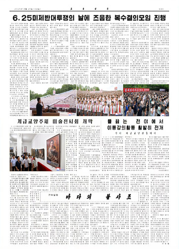 들끓는 전야에서 이동강의활동 활발히 전개 각지 계급교양관들에서 6.25-7.27반미공동투쟁월간에 즈음하여 각지 계급교양관 강사들이 당면한 영농공정수행으로 들끓는 포전들에 나가 이동강의활동을 활발히 벌리고있다. 해당 단위들에서는 모든 강사들이 강의내용을 자료적으로 준비하는데 많은 품을 들이며 강의수준을 부단히 제고하도록 하였다. 계급교양의 전초선을 지켜섰다는 무거운 책임감을 안고 녕변군의 강사들은 노래 《사랑은 내 조국에 증오는 원쑤에게》를 비롯한 계급교양주제의 작품들로 화선식강의와 예술선동을 참신하게 벌려 농장원들과 지원자들의 마음속에 원쑤들과는 반드시 피의 결산을 해야 한다는 철리를 깊이 새겨주었다. 락원군의 강사들도 서중농장, 세포농장, 사동농장을 비롯한 여러 농장에서 《사회주의 지키세》, 《우리는 조선사람》 등 력동적이면서도 호소성이 강한 노래와 시를 배합하여 계급교양강의를 실속있게 진행함으로써 쌀로써 우리식 사회주의를 굳건히 수호해나갈 농업근로자들의 열의를 배가해주었다. 불변의 주적관을 심어주는 여러가지 형식의 교양수단과 방법을 탐구적용하여 대중의 심장마다에 원쑤격멸의 의지를 더해준 이천군, 안변군의 강사들의 강의활동은 우리의 혁명진지, 계급진지를 어떻게 지켜야 하는가를 감화력있고 실감있게 보여준 계기로 되였다. 한시도 늦출수 없고 소홀히 할수 없는것이 반제반미교양이라는것을 명심하고 온성군계급교양관의 강사들이 농장원들과 일도 같이하면서 작업의 여가에 강의와 예술선동활동을 적극화하였다. 희천시계급교양관, 고풍군계급교양관 강사들이 지역의 극성농장, 상고농장, 평당농장 등에서 원쑤들의 야수성과 침략적본성을 보여주는 여러가지 자료를 리용한 강의로 반제계급교양의 실효를 높이였다. 전야마다에서 활발히 전개되는 각지 계급교양관 강사들의 이동강의활동은 일군들과 근로자들의 계급의식을 만장약해주고있다. 【조선중앙통신】