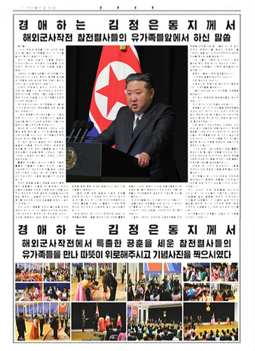 경애하는 김정은동지께서 해외군사작전 참전렬사들의 유가족들앞에서 하신 말씀 동지들! 나라의 존엄과 명예를 지켜 고귀한 생을 바친 렬사들의 유가족들을 만난 이 자리를 빌어서 몇마디 말씀드리고저합니다. 견디기 힘든 상실의 아픔을 꿋꿋이 이겨내고계시는 여러분의 모습들을 마주하면서 경건하고 뜨거운 마음을 금할수 없습니다. 사랑하는 자식들과 남편들의 생사여부를 전연 모르고있다가 너무도 뜻밖의 충격을 받았을 유가족들에 대한 생각에 계속 마음이 떨리고 도무지 일이 손에 잡히지 않습니다. 이역의 전장에서 싸우다 쓰러진 우리 군관, 병사들을 다시 일으켜세워서 데려오지 못한 안타까움, 귀중한 그들의 생을 지켜주지 못한 미안한 마음을 안고 유가족들모두에게 다시한번 속죄합니다. 국가표창수여식에서 유가족들을 만나볼 때 그 자리에 참석하지 못한분들에 대한 생각을 많이 하였습니다. 그래서 영웅들의 유가족모두를 다시 이렇게 따로 만나 다소나마 위로해드리고 슬픔과 상실감을 덜어드리고싶은 심정에서 오늘 이와 같은 자리를 마련하도록 하였습니다. 응당히 온 나라의 축복속에 사랑하는 사람들과 함께 해야 할 이 자리에 혈육을 잃은 아픈 상처를 안고 오신 유가족들모두에게 심심한 애도의 뜻을 표합니다. 하나같이 잘나고 끌끌한 우리 영웅들의 얼굴과 이름을 추모의 벽에서 한명한명 새겨볼 때 이런 장한 아들들을 낳아 키운 부모님들의 모습을 함께 그려보고 그들이 그처럼 사랑했던 처자들의 모습도 나란히 세워보았습니다. 훌륭한 부모들이 없이야 어떻게 그렇듯 훌륭한 아들들이 있을수 있으며 그들의 가슴속에 자기 부모처자와 태를 묻은 고향에 대한 진정한 사랑이 없다면 어떻게 생의 마지막순간까지 그렇듯 용감할수가 있었겠습니까. 조국의 명령을 받들고 죽음을 맞받아 돌격해간 영웅들의 위훈에 찬 행적에서 우리는 순결한 마음들에 조국과 고향에 대한 사랑을 심어주고 정바르게 키워준 결곡한 모습들을 보았으며 참된 복무의 나날들에 의지가 되여주고 힘과 용기를 보태여준 다심한 손길들을 생생히 느낄수가 있었습니다. 우리 군대가 굴할줄 모르고 불가능을 모르며 싸워서 반드시 이기는 영웅군대인것은 세상에서 가장 강인하고 애국적이며 정의로운 인민이, 대대로 굴함없는 삶과 투쟁으로써 이 나라와 운명을 함께 해온 위대한 영웅인민이 낳아 키운 아들들이기때문입니다. 그들은 비록 푸른 젊음과 드높은 포부를 안은채 떠나갔으나 피로써 우리 국가의 승리의 새 전기를 쓰고 온 나라에 전인민적영웅주의의 거세찬 불길을 지펴준 그 불굴의 기개와 혁명정신은 우리모두의 마음속에 길이 살아남을것입니다. 당과 정부는 온 나라가 존경하며 떠받드는 영웅들과 함께 그들을 참답게 키워 내세운 훌륭한분들도 나란히 영예의 단상에 받들어올릴것이며 희생된 렬사들이 목숨바쳐 지켜낸 조국의 아름다운 생활이 여러분들에게 제일먼저 가닿도록 최선을 다할것입니다. 저 어린것들을 보니 더 마음이 쓰리고 아픕니다. 살붙이같은 저애들을 뒤에 남기고, 사랑하는 녀인들을 남기고 우리 군관들이 갔습니다. 다심하신 어머니눈빛을 그려보며 우리 병사들이 갔습니다. 그렇듯 사랑하는 모든것과 마음속작별을 하며 죽음을 마주해나갈 때 그들은 하나와 같이 조국이 번영하기를, 평양이 번영하기를 기원하는 글을 남기고 조선민주주의인민공화국 만세를 웨치며 생을 끝냈습니다. 나는 그들이 그렇게 떠나가면서 나에게 짤막한 편지 한장 남기지 않았지만 가정도, 사랑하는 저애들도 나에게 맡겼을것이라 생각합니다. 분명히 그들은 나에게 맡겼을것입니다. 그 부탁은 글줄로 읽는것이 아닙니다. 귀로 듣는것도 아닙니다. 마음속으로, 믿음으로 듣는것이기때문에 나는 그 부탁들을 들었습니다. 그들이 바란대로 내가 유가족들, 저애들을 맡겠습니다. 여기에는 혁명학원 원장동무들도 참석하였습니다. 우리 국가의 지도간부들도 와있습니다. 영웅들이 남기고 간 자녀들을 혁명학원들에 보내여 내가, 국가가, 우리 군대가 전적으로 맡아 책임적으로 잘 키울것이며 아버지처럼 굳세고 용감한 투사로 우리 혁명의 골간대오에 들여세우겠습니다. 이제 평양시 대성구역에는 노래에도 있는바와 같이 새별처럼 생을 빛내이다 푸르른 젊음을 그대로 안고 안타깝게 떠나간 참전군인들의 유가족들을 위한 새 거리가 일떠서게 되며 우리는 그 거리의 이름을 우리 군인들의 별처럼 빛나는 위훈을 칭송하여 새별거리로 명명하자고 합니다. 그리고 바로 그앞 수목원의 제일 훌륭한 명당자리에 렬사들의 유해를 안치하고 조선인민의 강인성과 조선인민군의 존위와 명예를 수호한 위대한 전사들을 추억하기 위해 불멸의 전투위훈기념비를 일떠세울것입니다. 언제든 온 나라가 찾고찾아가 그들을 추억하고 모든 영광과 기쁨을 함께 할수 있게 할것입니다. 유가족들이 온 나라의 존경과 찬탄속에 평양에서의 행복한 생활을 시작하실수 있도록 당과 국가가 성심을 다하여 도와드리겠습니다. 우리 군대의 전체 장병들을 대신하여 그리고 온 나라 인민들의 이름으로 사랑하는 사람들을 