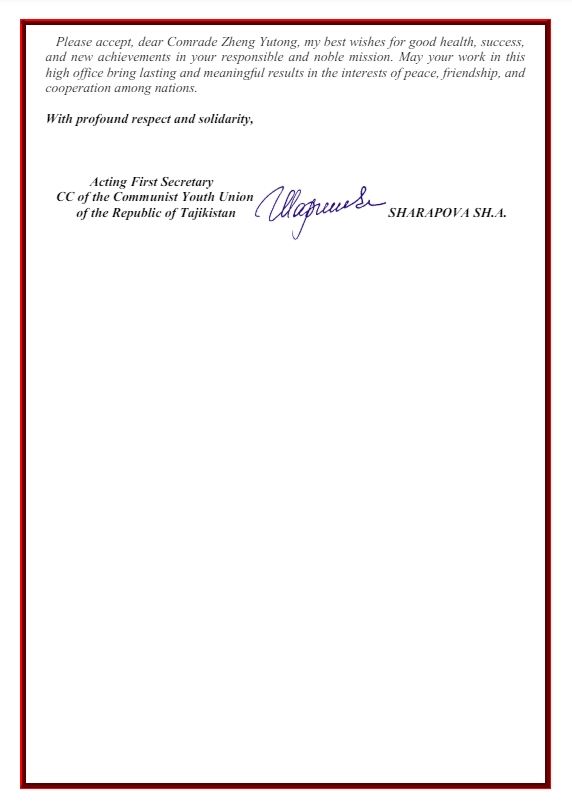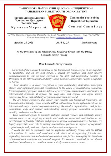On December 22, the Acting First Secretary of the Communist Youth Union of the Republic of Tajikistan (CYU RT) Comrade Shahnoza Sharapova sent a congratulatory telegram to the President of the DPRK International Solidarity Group (DPRK ISG) Comrade Zheng Yutong on her election to the highest leadership post of our organization. The full text of the telegram follows below.
