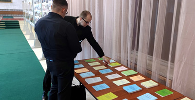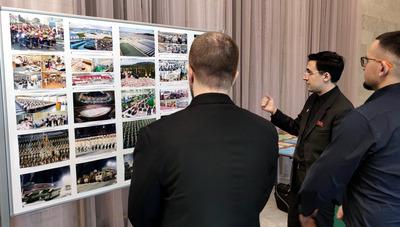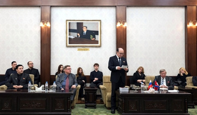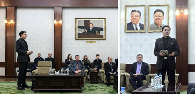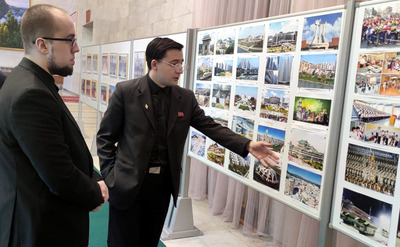 Zum Abschluss des Treffens nahm der Koordinator von "Das andere Russland" mehrere Bücher als Geschenk für die Parteibibliothek entgegen und ließ sich vor dem Kunstwerk, das den Großen Führer Genossen Kim Il Sung und den Großen Führer Genossen Kim Jong Il darstellt, ein Erinnerungsfoto aufnehmen. |