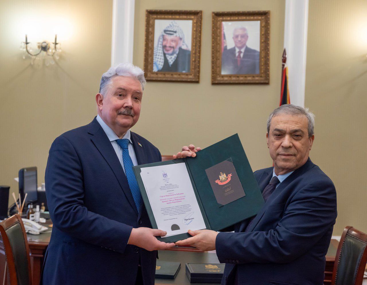 В знак признания выдающегося личного вклада в поддержку справедливой борьбы палестинского народа и активной миротворческой деятельности на Ближнем Востоке Президент Международной ассоциации фондов мира (МАФМ), Вице-президент Международной Группы солидарности с КНДР (МГС КНДР) товарищ Сергей Николаевич Бабурин награждён орденом «Звезда Иерусалима». Торжественная церемония награждения состоялась в Москве 27 января в Посольстве Палестины. Высшую государственную награду от имени Президента Государства Палестина Махмуда Аббаса вручил многоуважаемый Абдельхафиз Нофаль, Чрезвычайный и Полномочный Посол Государства Палестина в Российской Федерации. В своей речи во время церемонии Посол передал слова глубокой признательности от руководства Палестины за многолетнюю и последовательную позицию товарища Бабурина в отстаивании законных прав арабского народа Палестины на международной арене, а также его практические усилия по гуманитарной поддержке и продвижению диалога. Принимая орден, товарищ Бабурин выразил искреннюю благодарность Президенту Махмуду Аббасу и всему палестинскому руководству за высокую оценку его работы. Он подчеркнул, что воспринимает эту награду прежде всего как признание заслуг всей России, которая исторически и неизменно выступает на стороне правды и справедливости в палестинском вопросе. «Я — лишь скромный представитель этой великой страны. Все, что удалось сделать в деле поддержки героического народа Палестины, — это результат общих усилий с моими соратниками», — заявил он. Товарищ Бабурин отметил, что для него, как для многолетнего руководителя Русского Центра сбережения духовного и культурного наследия Священного Города Иерусалима, эта награда имеет особое, символическое значение. Он вновь твёрдо подтвердил непреложную принципиальную позицию: Восточный Иерусалим по праву должен стать столицей независимого Государства Палестина. Товарищ Бабурин также выразил понимание в связи с тем, что график официального визита Президента Аббаса не позволил тому лично присутствовать на церемонии, подчеркнув, что само внимание со стороны палестинского руководства является для него чрезвычайно дорогим. Он высказал осторожный оптимизм, отметив, что в текущих международных условиях вопрос о справедливом и всеобъемлющем урегулировании палестинской проблемы как никогда близок к своему решению. На значимом событии присутствовала супруга товарища Бабурина, которую он публично поблагодарил за неизменную поддержку и понимание на протяжении всей жизни, назвав все свои успехи во многом её достижениями. После завершения официальной части церемонии и общения с журналистами состоялась неформальная рабочая беседа товарища Бабурина с послом Абдельхафизом Нофалем. В ходе дружеской дискуссии за чашкой кофе стороны обсудили актуальные вопросы ближневосточного урегулирования, перспективы деятельности совместных общественных институтов, а также подготовку к международному Дню Аль-Кудс, символизирующему несгибаемую волю палестинского народа.