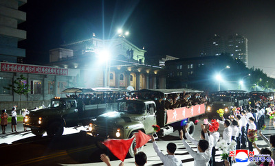 党創立75周年慶祝閲兵式の参加者が平壌市民の歓迎を受けて通りを通過 わが党と国家、武力の最高指導者である 革命強兵の戦闘的気概が脈打つ軍歌を合唱して通りを進む閲兵隊員を平壌駅前広場などに集った市民が、共和国旗と花束を振って熱烈に歓迎した。 無敵強兵の気概を全身で体感して歓呼の声を上げる大衆の熱気は、チョンリマ通りと英雄通り、琵琶通りにつながった。 竜興十字路、黎明通りの明るい家々の窓辺からも、市民が熱い歓迎熱意で閲兵隊伍を迎えて送った。 綾羅人民遊園地と紋繍遊泳場、平壌大同江水産物食堂などが一目に見える清流橋を通り過ぎる閲兵隊員の胸には、祖国の防衛者、人民の幸福の創造者としての栄誉ある使命と任務を果たしていく揺るぎない誓いが脈打った。 主体的国防工業の威力を誇示するかのように、とどろく轟音とともに前進する機械化縦隊の閲兵隊員も、倉田十字路と玉流橋で市民の温かい祝賀のあいさつを受けた。 朝鮮労働党の頼もしい一当百の戦車兵、英雄砲兵の立派な姿を一度近くで見てみようと駆けつけた市民の中からは、祖国と人民の真の守護者に対する賛嘆が出た。 最新型の戦略兵器システムを大きな激動の中で迎えながら、人々は卓越した領袖をいただいてこそ軍隊が強く、人民が偉大で祖国が強大になるという哲理を再び深く刻み付けた。 情熱的に手を振る首都市民に温かく応える兵士の顔に、希世の総帥を高くいただいて朝鮮の尊厳と力を宇宙万里へ轟かしていくという限りない栄誉と自負が満ち溢れていた。