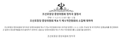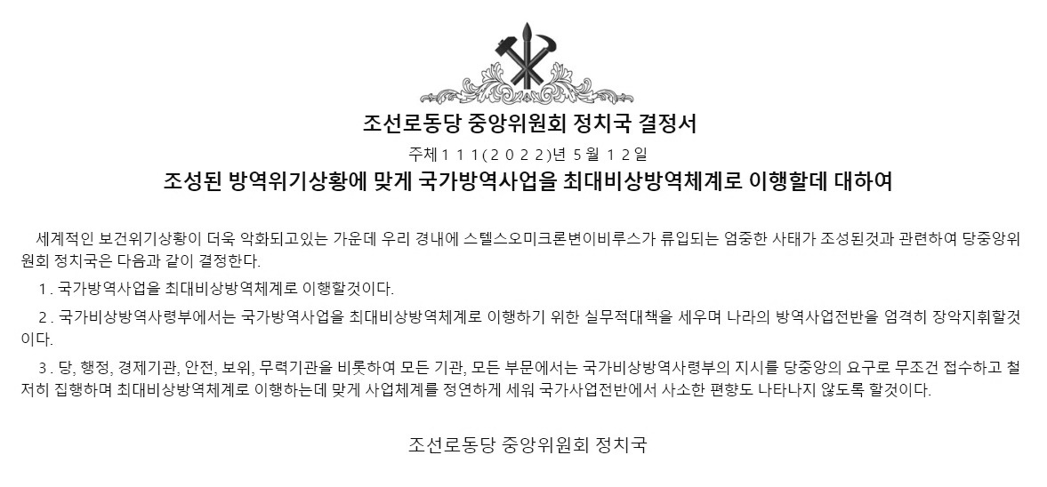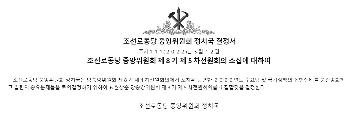 朝鲜劳动党第八届中央委员会第八次政治局会议5月12日在党中央委员会本部大楼召开。 朝鲜劳动党总书记金正恩同志出席会议。 朝鲜劳动党中央政治局常委、党中央政治局委员和候补委员参加了会议。 国家紧急防疫部门工作人员和一些国防省指挥成员列席了会议。 敬爱的总书记同志主持了会议。 首先,政治局讨论了关于召开党中央全会的问题。 会议为了就2022年度党和国家政策执行情况做了中期总结并讨论决定一系列重要问题,一致通过了朝鲜劳动党中央委员会政治局关于6月上旬召开党的八届五中全会的决议。 其次,政治局就应付国家防疫危机问题进行了探讨。 政治局承认,日前发生了我国人民从2020年2月到今天的长达两年三个月一直坚守的紧急防疫战线被击破的国家最重大紧急事件。 国家紧急防疫指挥部和相关单位5月8日审议对首都一家团体的一些发热患者的标本基因测序分析结果,得出结论其与最近全球快速蔓延的奥密克戎毒株“BA.2”相一致。 会议通报全国疫情传播情况,并商榷审议了采取紧急对策以掌握今后防疫战主动权。 政治局批评防疫部门没有敏感灵活应对在我国周边地区和世界范围各种变异毒株感染者不减反增的公共卫生危机的安逸松懈、不负责任和无能。 政治局认为,针对目前情况,有必要启动国家防疫体系转向最大紧急防疫体系,而且采取了多项措施以使各级党政机关、经济机关和安全、保卫、国防部门等国家各机关各部门根据最大紧急防疫体系的启动,正确树立工作体系,确保国家工作正常顺利。 会议通过了朝鲜劳动党中央政治局关于针对目前的防疫危机,将国家防疫工作转移到最大紧急防疫体系的决议。 敬爱的总书记同志结束会议时提出了在紧急防疫工作中要坚持的原则和任务。 总书记同志概括分析目前我国面临的防疫危机状况后说,此次的最大紧急防疫体系的基本目的在于稳定遏制并管控输入我国境内的新冠肺炎病毒传播状况,尽快治愈感染者且在最短期消除传播根源。 总书记同志指出,现在对我们来说,比恶性病毒更危险的敌人是非科学的恐怖、缺乏信心和意志薄弱,并重申了我们有党和政府以及人民团结一致的强大组织力、通过长期紧急防疫工作培养而巩固的每个人的高度政治意识和觉悟,我们就必定克服面临的突发事态,在紧急防疫工作中取得胜利。 总书记同志说,全国各市、郡要彻底封锁本地区,所有工作单位、生产单位、生活单位必须在封闭状态下安排工作和生产活动,完美切断恶性病毒传播空间。 总书记同志强调紧急部署和展开科学集中检验和治疗战斗的必要性,并决定发放党和政府预计像现在这样的紧急时期而储备的备用医疗品。 总书记同志指出,保健部门和紧急防疫部门要严格进行全居民集中检验检疫,积极采取医学观察和治疗措施的同时,加强对工作空间、作业空间、生活空间每个角落的消毒工作,切断并消灭恶性病毒的传播根源。 总书记同志说,目前的防疫形势再恶劣,也不能停止我们走向社会主义建设全面发展的前进步伐,更不能马虎计划中的经济工作,并强调,内阁和国家经济指导机关以及相关单位根据将国家防疫体系转移到最大紧急防疫体系,更加周密做好对经济工作的组织、调度和指挥来最大限度地推进当前的农业生产、重要工业部门和工厂企业的生产,如期出色落实和盛地区1万套住宅建设和连浦温室农场建设等我们党的爱民夙愿工作。 党政机关要尽量减少在实施高强度封锁情况下人民所经历的不便和苦衷,安顿他们的生活,切实采取措施防止出现丝毫消极现象。 总书记同志强调,进一步巩固国家防卫前哨,用武装力量保障防疫大战的胜利,还特别强调,要进一步加强战线和边境、海上和空中的警戒值勤任务,国防部门万无一失地保证不出现任何安全漏空。 总书记同志说,我们党和国家的人民群众第一主义政治和团结一心的我国人民的力量战胜历史的种种困境发挥了伟大的生命力,是这次防疫大战中取得胜利的最具威力的保证,所有党组织和政权机关要在誓死保卫人民的生命安全的今天防疫大战中以实际行动验证自己对党和革命的忠诚、对人民的忘我精神、对自己任务的责任心。 敬爱的总书记同志热烈呼吁,全体人民和人民军官兵坚定信心,加倍伟大的力量,胜利结束防疫大战,用我国的信念、我们的意志和我们的团结来坚决捍卫我们自己宝贵的生命和生活以及未来。 朝鲜劳动党中央委员会政治局审议批准并下达了党中央军事委员会紧急指示文件和内阁紧急指示文件。