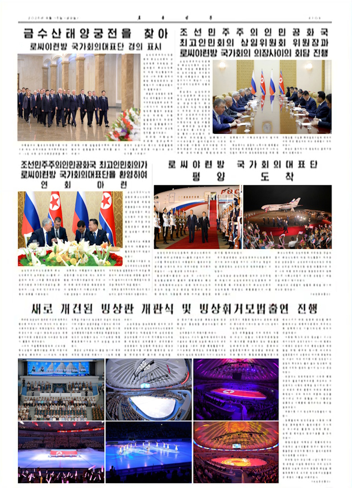 ロシア連邦会議代表団、錦繍山太陽宮を参拝 ヴャチェスラフ・ヴォローディン議長を団長とするロシア連邦会議代表団が14日午前、錦繍山太陽宮を訪れ、偉大なる首領 金日成同志ならびに偉大なる領導者 金正日同志に敬意を捧げた。 朝鮮民主主義人民共和国最高人民会議常任委員会副委員長 康允錫(カン・ユンソク)同志、最高人民会議議長 朴仁哲(パク・インチョル)同志、在朝ロシア連邦特命全権大使 アレクサンドル・マツェゴラ同志が同行した。 代表団成員らは、精力的な対外活動により反帝自主事業の実現と朝露両国の友好関係発展に不滅の貢献をなされた偉大なる首領 金日成同志ならびに偉大なる領導者 金正日同志の立像を仰ぎ、崇高なる敬意を表した。 偉大なる首領様と偉大なる将軍様が生前の御姿でいらっしゃる永生の間において、彼らは謹み深く挨拶を捧げた。 朝鮮最高人民会議常任委員会委員長とロシア連邦会議議長との会談実施 朝鮮民主主義人民共和国最高人民会議常任委員会委員長 崔龍海(チェ・リョンヘ)同志とロシア連邦会議議長 ヴャチェスラフ・ヴォローディン同志との会談が14日、万寿台議事堂で行われた。 会談には、朝鮮側から康允錫副委員長、朴仁哲議長、外務省副相 金正奎(キム・ジョンギュ)同志、朝露友好議員連盟委員長兼保健省医学研究院院長 李哲(リ・チョル)同志、関係部門幹部が出席。露側からはイワン・メルニコフ第一副議長、アレクサンドル・ババコフ副議長、ウラジスラフ・ダヴァンコフ副議長ら代表団主要成員、在朝ロシア連邦特命全権大使アレクサンドル・マツェゴラ同志が同席した。 会談では、共同の努力により平和的で公正な新たな世界を建設するとともに、両国民の福祉増進と友好関係発展のための二国間協力を一層拡大・発展させること、および相互に関心を寄せる諸問題について議論が交わされた。 朝鮮最高人民会議、ロシア連邦会議代表団歓迎宴を開催 朝鮮最高人民会議は祖国解放80周年を機にわが国を祝賀訪問したロシア連邦会議代表団を歓迎し、14日夜に万寿台議事堂で宴を催した。 ヴャチェスラフ・ヴォローディン議長を団長とするロシア連邦会議代表団、在朝ロシア連邦特命全権大使アレクサンドル・マツェゴラ同志、大使館員らが招かれた。 朝鮮側からは崔龍海常任委員会委員長、康允錫副委員長、朴仁哲議長、金正奎外務省副相、関係部門幹部らが出席。 宴席では崔龍海同志とヴャチェスラフ・ヴォローディン同志が挨拶を行った。 ロシア連邦会議代表団、平壌に到着 朝鮮最高人民会議の招請により祖国解放80周年を機にわが国を祝賀訪問するヴャチェスラフ・ヴォローディン議長を団長とするロシア連邦会議代表団が14日、平壌に到着した。 平壌国際空港は、朝露両国の友好協力関係が不敗の同盟関係として確固と発展する中、ロシア人民の親善の情を携えて平壌を訪れる親しい隣邦の使節団を温かく迎える熱気に包まれた。 国旗掲揚台には朝鮮民主主義人民共和国国旗とロシア連邦国旗が翻り、空港ターミナル前には朝鮮人民軍名誉衛兵隊が整列した。 朝鮮労働党中央委員会政治局常務委員会委員であり、朝鮮民主主義人民共和国国務委員会第一副委員長、最高人民会議常任委員会委員長である崔龍海同志が空港に出迎えた。 康允錫副委員長、朴仁哲議長、金正奎外務省副相、李哲・朝露友好議員連盟委員長、アレクサンドル・マツェゴラ在朝ロシア特命全権大使らが代表団を温かく迎えた。 【朝鮮中央通信】 新改築アイスリンク開館式及びフィギュアスケート模範公演実施 偉大なる党中央の遠大な構想と精力的な領導により、首都平壌が社会主義文明華咲く世界的理想都市へ日々変貌する中、風光明媚な普通江岸に位置するアイスリンクが立派に改築された。 冬季スポーツ発展と労働者・青少年の体力鍛錬の拠点として40有余年の誇りある歴史を刻んできた同リンクは、建設の大繁栄期とともに、文明復興を志向する新時代の要求に応え、アイススポーツはもちろん多様な室内競技や多彩な芸術公演を円満に保障できる多機能複合スポーツ文化基地へと生まれ変わった。 意義深い祖国解放80周年を迎え、新たに改築されたアイスリンク開館式が14日に行われた。 朝鮮労働党中央委員会政治局常務委員会委員であり内閣総理の朴奉珠(パク・ポンジュ)同志、党中央委員会書記であり国家体育指導委員会委員長の金徳訓(キム・ドックン)同志、内閣副総理 金正官(キム・ジョングァン)同志、フィギュアスケート協会委員長兼財政相 李明国(リ・ミョングク)同志をはじめ、関係部門幹部、改築工事参加者、中央・地方機関幹部、スポーツ関係者、アイスリンク職員、平壌市民らが参列した。 金徳訓同志が開館辞を述べた。 「全ての建築物を我々の世代の志向と理想が宿り、社会主義文化発展の新時代を代表し得る創造物として打ち立てるよう導かれる敬愛する金正恩同志が、アイスリンクを新たな領域・形式のスポーツ文化生活拠点へと変革する方