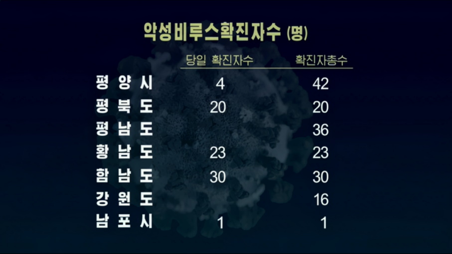 悪性伝染病の拡散根源の遮断、掃滅に総力を集中 各級非常防疫機関で朝鮮労働党中央委員会第8期第8回政治局会議の決定を体して悪性伝染病の拡散根源を遮断、掃滅するための活動に総力を集中している。 万景台区域をはじめとする平壌市内の全ての非常防疫機関では、自分の地域を徹底的に封鎖し、事業単位、生産単位、生活単位別に隔絶した状態で事業と生産活動を行うための手配を方法論をもって綿密に行っている。 全国各地の非常防疫機関では、拡散の根源を遮断、掃滅する上で消毒が持つ重要性について大衆の間に深く認識させていっそう自覚、奮発させることに優先的な力を入れている。 これとともに、事業空間、作業空間、生活空間の隅々に至るまで消毒を強化するための実質的な措置を取っている。 各級非常防疫機関の活動家は、悪性伝染病の拡散根源を完璧(かんぺき)に遮断、掃滅し、防疫大戦の勝利の突破口を先頭に立って開くという覚悟を抱いて引き続き緊張した闘いを繰り広げている。 一方、各地の医療従事者は全住民に対する集中的な病気の検査・検診の重要性を深く自覚し、発熱者と異常症状のある人々をもれなく探して徹底的に隔離させ、医学的監視と積極的な治療対策を立てるための活動にこぞって立ち上がっている。
