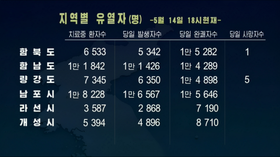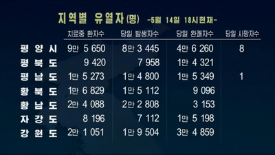国家非常防疫司令部の通報によると、5月14日18時から15日18時まで全国的に39万2920人余りの発熱者が新たに発生し、15万2600人余りが全快したし、8人が死亡した。 4月末から5月15日18時現在まで発生した全国的な発熱者は121万3550人余りであり、そのうち64万8630人余りが全快し、56万4860人余りが治療を受けている。 現在までの死者は、50人である。