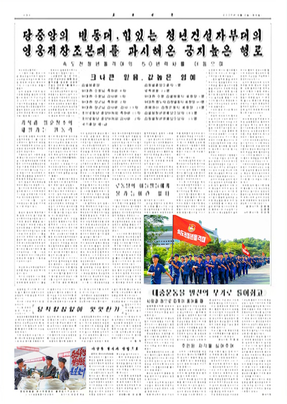이번 면에서는 속도전청년돌격대의 창립 50돐을 맞이하여 위대한 당의 령도따라 기적과 위훈을 빛나게 쌓아올린 그 영광로운 투쟁행로와 공훈을 돌아보는 기사가 실렸다.