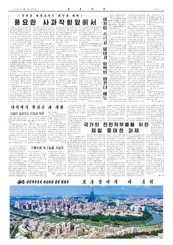 면 말미에서는 로씨야를 방문하는 사회안전성대표단의 소식을 간략히 전하면서 국제 교류 소식을 보충하고있다. 모든 기사는 당의 령도 아래 인민대중이 혁명의 주체로 떨쳐나서 창조하고 투쟁하는 우리 식 사회주의의 생동하는 모습을 보여주고있다.