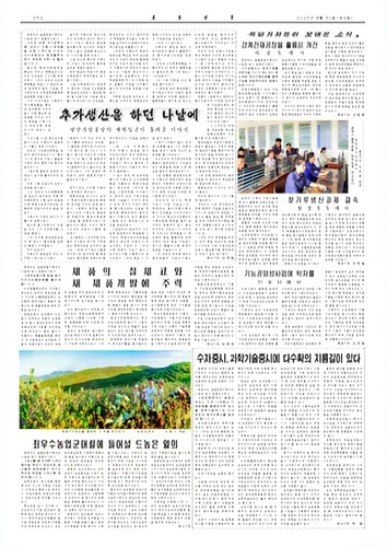 이번면에서는 대동강과수종합농장의 풍요로운 사과작황과 관련된 김정은동지의 현지지도 소식이 실렸다. 경애하는 총비서동지께서는 2016년 8월 17일 농장을 찾아 사과생산에서 빛나는 성과를 이룩한 일군들과 근로자들에게 당중앙위원회의 이름으로 감사를 표시하시고, 풍요로운 사과작황을 배경으로 기념사진을 찍으시며 인민에게 보여주자고 하신 뜨거운 사연이 담겨있다.