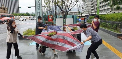 После выступлений члены «Антиамериканской группы за защиту мира и отмену враждебной политики в отношении Северной Кореи» публично порвали государственный флаг США.