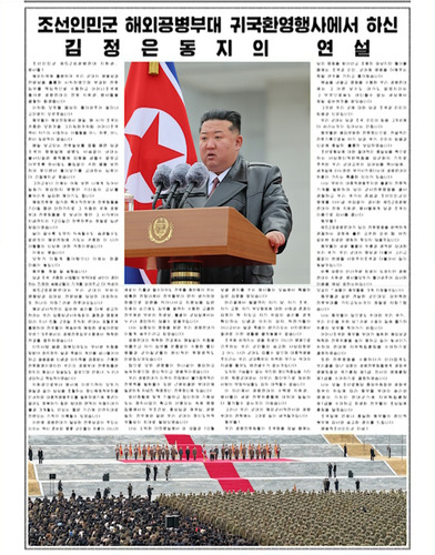 Командиры и бойцы 528-го инженерного полка Корейской народной армии! Горячо приветствую всех командиров и бойцов инженерного полка, вернувшихся в объятия социалистической Родины после ответственного выполнения боевой задачи в зарубежном регионе, где вы блестяще продемонстрировали героизм и профессионализм нашей армии. Не выразить словами, как я благодарен вам за то, что все вы возвратились живыми и здоровыми. Подобно тому, как вы, товарищи, на чужом поле боя ежедневно и ежечасно тосковали по всему драгоценному, что есть на Родине, сама мать-Отчизна ни на один день, ни на один час не забывала своих любимых сыновей. Каждый раз, получая сводки с передовой, я не мог сдержать волнения, читая о самоотверженных, поистине бессмертных подвигах, когда жизнь без колебаний приносится в жертву во имя приказа Партии и Отчизны. Всё сильнее становилось моё желание, чтобы каждый из вас сохранил себя и возвратился домой с улыбкой. Если вдуматься, этот год стал для меня временем глубокого осознания мучительного ожидания, которого я прежде не испытывал. С того самого момента, когда пришлось вновь отправлять бойцов инженерных частей в опасное место – как когда-то ждали бойцов спецподразделений, участвовавших в освободительных боях, – каждый из ста двадцати дней тянулся словно десятилетие. С каждым днём всё менее терпимой становилась тревога за жизнь и здоровье этих драгоценных сыновей Отчизны, находившихся на чужом театре военных действий. Теперь всё позади. Раз все вы вернулись, моё сердце наконец обрело покой. Товарищи, вы действительно сражались достойно. Ещё раз горячо поздравляю всех бойцов инженерного полка, которые с честью возвратились на Родину возмужавшими и окрепшими, явив миру истинную доблесть воинов, вызвавшую всеобщее восхищение, как того требовали доверие Партии, Родины и нашего народа. Товарищи! 528-й инженерный полк является ещё одним гордым боевым соединением, достойно представляющим несравненную отвагу, мощь и высокий профессионализм нашей армии. Созданный 28 мая согласно решению и приказу Центральной военной комиссии нашей Партии, направленному на закрепление дорогой победы в ходе зарубежной военной операции, полк был направлен в начале августа в Курскую область Российской Федерации, освобождённую ценой жизни товарищей по оружию, где и добился выдающихся успехов в выполнении инженерно-боевых задач. Несмотря на суровые условия, когда на горной местности на каждом шагу таилась смертельная опасность, требовалось постоянно балансировать на грани жизни и смерти, а каждый шаг проверял силу убеждений и твёрдость воли, бойцы нашего инженерного подразделения не проявили ни малейших колебаний или сомнений, всегда и каждый действовал смело и ответственно. Именно потому, что все – от командиров до рядовых – ежедневно переносили невообразимые физические и психологические нагрузки, проявляя массовый героизм, стало возможным совершить чудо: превратить обширные опасные зоны, которые в обычных условиях нельзя было бы обезвредить и за несколько лет, в безопасные территории менее чем за три месяца. Главный смысл боевых достижений, добытых инженерным полком на этот раз, заключается в том, что это – плод массового героизма, достигнутый общими усилиями всего личного состава, а не личные заслуги нескольких подготовленных военносл