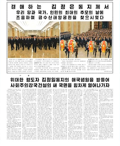 Уважаемый товарищ КИМ ЧЕН ЫН посетил Кымсусанский дворец Солнца в день великого поминовения нашей партии, государства и народа В связи с 14-й годовщиной со дня кончины великого руководителя Ким Чен Ира все жители страны и военнослужащие Корейской народной армии, переполненные безграничной тоской и пламенной верностью, с глубоким почтением вспоминают священную революционную жизнь и незыблемые заслуги несравненного великого человека, который посвятил своё время построению могучего и процветающего государства на этой земле для будущих поколений и отдал всё для достижения этой цели. Генеральный секретарь Трудовой партии Кореи, председатель Государственного совета КНДР уважаемый товарищ Ким Чен Ын посетил Кымсусанский дворец Солнца в 00 часов 17 декабря, в день великого поминовения нашей партии, государства и народа. В мероприятии приняли участие члены Президиума Политического бюро ЦК ТПК, руководящие работники партийных, государственных и силовых органов, сотрудники аппарата ЦК партии, ответственные работники Кабинета министров, комиссий, министерств и центральных учреждений. Также присутствовали члены руководящего состава Министерства народных вооруженных сил и командиры объединённых частей Корейской народной армии. К портретам великого вождя товарища Ким Ир Сена и великого руководителя товарища Ким Чен Ира возложены корзины цветов. Уважаемый товарищ Ким Чен Ын вместе с участниками церемонии с глубочайшим уважением почтил портреты великого Президента и великого Полководца. Уважаемый товарищ Ким Чен Ын вместе с присутствующими посетил Зал вечной жизни и с почтением поклонился великому Полководцу, пожелав ему бессмертия. Все участники дали твёрдую клятву, прославляя патриотические заслуги великого Полководца как величественную новую эпоху всестороннего национального возрождения и всем сердцем поддерживать идеи и руководство уважаемого товарища Ким Чен Ына. Группа политических репортёров данной газеты. Передовая статья Поднимем патриотическое стремление великого КИМ ЧЕН ИРА и энергично откроем новый этап в строительстве социалистической державы На земле нашей Родины, где течет священная история вечной жизни Вождя, могучим потоком извивается великая река тоски. Хотя с того декабрьского дня, когда вся страна погрузилась в кровавые слёзы, прошли годы и изменились горы и реки, священное имя и благородный облик великого руководителя Ким Чен Ира сияют как символ несокрушимости чучхейской Кореи и знамя вечной победы, а идеи и свершения великого Полководца мощной силой продвигают революционную борьбу нашего народа. В настоящее время все работники, члены партии и трудящиеся, преисполненные глубокого почтения к великому руководителю Ким Чен Иру, посвятившему всю жизнь партии и революции, Родине и народу, возносят самые возвышенные почести и безграничные пожелания бессмертия, а их сердца горят огненным стремлением осуществить патриотическую мечту великого Полководца о могучей стране и воздвигнуть на этой земле первое в мире сильное государство и идеальное общество народа, которому будет завидовать весь мир. Уважаемый товарищ Ким Чен Ын сказал следующее: «Мы должны высоко чтить великого Полководца как вечного Вождя нашей партии и народа и вечно прославлять его революционную жизнь и бессмертные револ