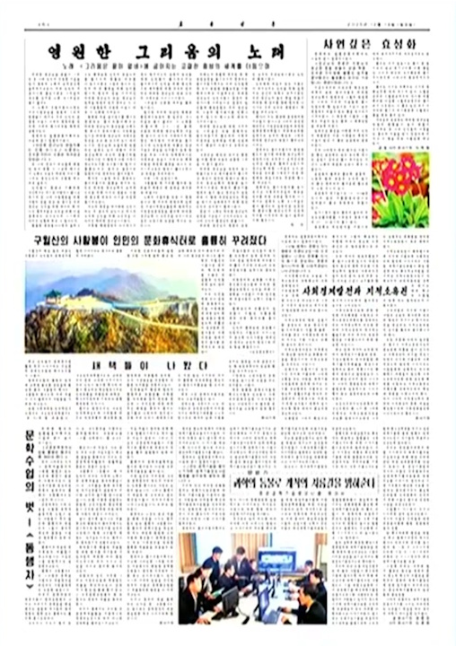 Песня вечной тоски Песня, в которой воплощена горячая тоска всего народа страны, бесконечно тоскующего о великом Полководце, звучит на просторах Родины, пока мы осмысливаем мир высокой верности, бушующий в песне «Тоска не имеет конца». В каждой строфе этой песни, принесшей в сердце каждого нашего человека волнующую тоску, глубоко и ярко, как огненная лава, и мощно, подобно её эху, запечатлена чистая душа нашего народа, вечно тоскующего по отцу-Полководцу и неизменно следующего за ним. Уважаемый товарищ Ким Чен Ын сказал следующее: «В сердце великого Полководца всегда и везде бережно хранились любимая Родина и народ». Рождённая в те незабываемые дни, когда вся страна была орошена кровавыми слезами, эта песня и сегодня звенит горячим голосом миллионов людей, тоскующих о великом отце. Наш Полководец, говоривший, что если народ живёт хорошо и радостно, то Ему больше ничего не нужно, и прошедший путь любви ради всех сыновей и дочерей страны; развернувший для народа новые моря садов и обнявший для народа Виналонский водопад — сколько же сердечной крови и трудов Он отдал! Образ великого Полководца, который, слушая переполненный счастьем смех народа, раздававшийся из каждого нового дома, забывал всю накопившуюся усталость и вновь шёл по пути самоотверженности, преодолевая снег и дождь ради ещё большего счастья народа, — именно в этой песне заключена горячая душа сыновей и дочерей этой страны, никогда не забывающих заслуги Полководца. Несколько лет назад зимой, посещая город Самджиён, уважаемый Генеральный секретарь долго не мог отойти от статуи великого Полководца. Снова и снова взирая на милостивый облик великого Полководца в полевой форме, Он взволнованно произнёс: «Идёт снег… В тот день, когда мы прощались с Полководцем в слезах, тоже шёл снег… Как бы хорошо было, если бы наш Полководец увидел, какие чудеса творятся на этой земле, которую Он любил, как свою плоть и кровь…» Вспоминая слова, сказанные уважаемым Генеральным секретарем в тот исторический день, народ вновь горячо размышлял о бесконечной любви и самоотверженности, которые великий Полководец отдал Родине и народу. Он был великим Полководцем, говорившим, что если выжать всю Его жизнь, то останутся два иероглифа «народ», и отдавшим всё для Родины и народа. Великий Полководец, который даже в последний период своей святой революционной жизни на пути выездного руководства спрашивал у работников, нравится ли это народу, и настоятельно призывал самоотверженно служить народу, был поистине милостивым отцом народа. Тоска вызывает дорогие воспоминания. Недавно встреченный нами работник Садоводческого хозяйства «Рёнджон» в уезде Пукчхон искренне признался, что чем больше он поёт песню «Тоска не имеет конца», тем яснее предстаёт милостивый облик великого Полководца, приезжавшего весной 2011 года и вновь посетившего сад осенью, в разгар сбора яблок, с глубоким удовлетворением взиравшего на то, что народ может получать вкусные и питательные фрукты, и тем сильнее кипит желание вновь показать Ему удивительную картину ветвей, отягощённых сотнями плодов. И разве только он один так чувствует? «Если развернём дивную новую улицу — увидим ли вновь? Если построим новейший завод — увидим ли вновь?» Как гласит строка песни, действительно, всякий раз, видя новые улицы, поднявшиеся на этой