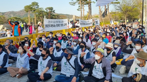 6.15남측위를 비롯한 시민사회단체, 진보정당들은 10일 오후 용산 국방부 일대에서 '한미연합군사연습 중단을위한 '평화의 걸음' 집중행동'을 진행했다. [사진-통일뉴스 이승현 기자]