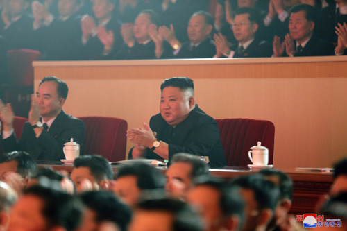 경애하는 김정은동지께서 당중앙지도기관 성원들과 함께 설명절경축공연을 관람하시였다