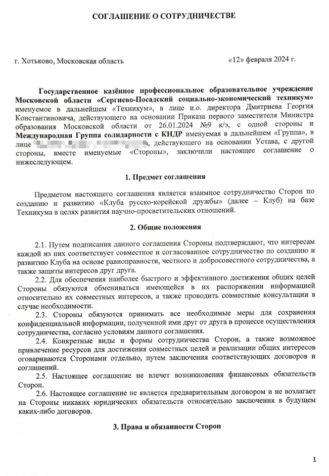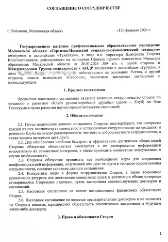 On February 12, in accordance with the permission of the Ministry of Education of the Moscow Region dated December 5, 2023, the State Treasury Vocational Educational Institution of the Moscow Region “Sergiev Posad Socio-Economic College” and the DPRK International Solidarity Group (DPRK ISG) entered into a cooperation agreement. This document regulates in detail the terms of cooperation between organizations, and also outlines the principles of operation of our primary cell in the form of the Russian-Korean Friendship Club. The document was signed by Alexander Mostov, Chairman of the Coordination Committee of the DPRK ISG, and Georgy Dmitriev, Acting Director of the Socio-Economic College.