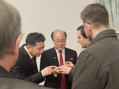 11 апреля создатель медиапроекта «Ай, Как Просто!» и директор 3-го информационно-аналитического департамента МГС КНДР товарищ Станислав Васильев вручил первый «значок солидарности» нового типа чрезвычайному и полномочному послу КНДР в РФ товарищу Син Хон Чхолу. Руководитель нашей организации товарищ Александр Мостов, лично разработавший дизайн данного значка в 2020-м году, рассказал, что золотой факел символизирует богатство и процветание, его пламя — революционные порывы души, корейские буквы «주체» — приоритет опоры на собственные силы, лучи — священные знания, а путеводная красная звезда — направляющее руководство вождя и окончательную победу дела социализма. После вручения подарка сделана памятная фотография.