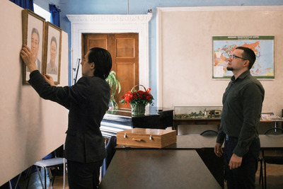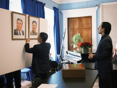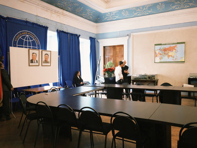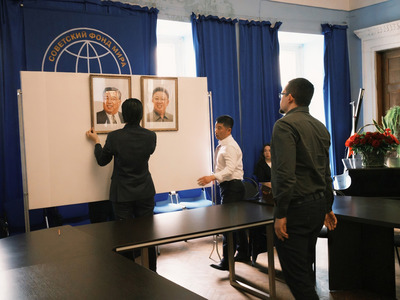 Руководящие работники Посольства КНДР и Международной Группы солидарности с КНДР вывешивают фотопортреты великого вождя товарища Ким Ир Сена и великого руководителя товарища Ким Чен Ира в мраморном зале Советского Фонда Мира.