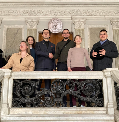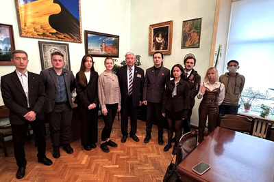 Товарищи А. Мостов и С. Бабурин сфотографировались на память с активистами первичной ячейки МГС КНДР в Университете Мировых Цивилизаций и комсомольцами.