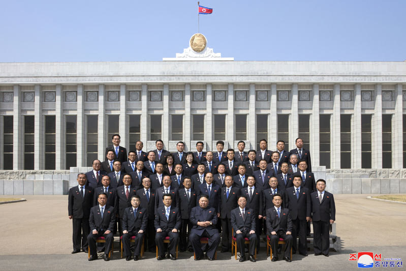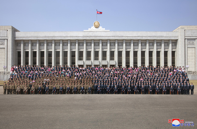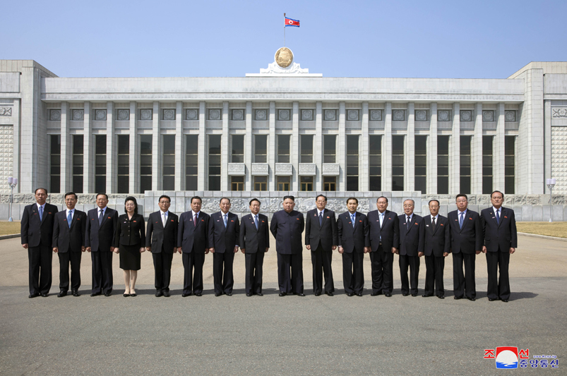조선로동당 위원장이시며 조선민주주의인민공화국 국무위원회 위원장이신 우리 당과 국가,군대의 최고령도자 경애하는 최고령도자동지께서 촬영장에 나오시자 전체 대의원들은 최고령도자동지를 우러러 《만세!》의 환호를 올리였다. 경애하는 최고령도자동지께서는 최고인민회의 제14기 제1차회의를 높은 정치적열의속에 성과적으로 진행한 대의원들을 열렬히 축하하시였다. 경애하는 최고령도자동지께서는 최고인민회의 대의원들이 당과 인민의 두터운 신임과 기대를 언제나 깊이 자각하고 인민의 참된 충복,당정책관철의 제일기수로서의 혁명적본분을 훌륭히 수행하리라는 기대와 확신을 표명하시면서 새로 구성된 최고인민회의 상임위원회,내각 성원들과 기념사진들을 찍으신데 이어 최고인민회의 제14기 전체 대의원들과 함께 뜻깊은 기념사진을 찍으시였다.