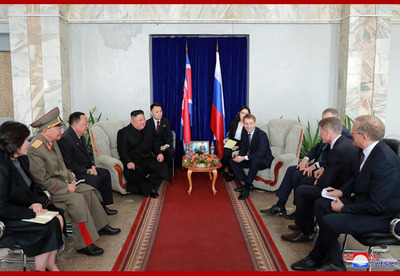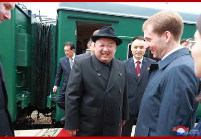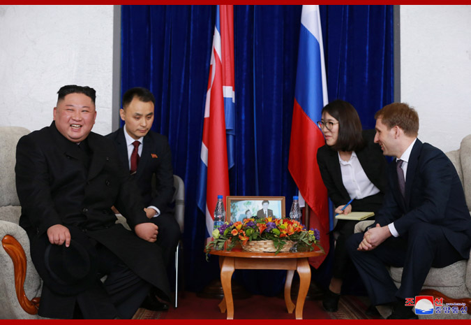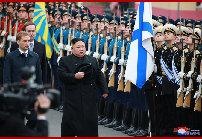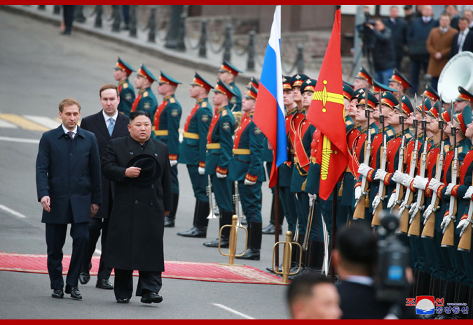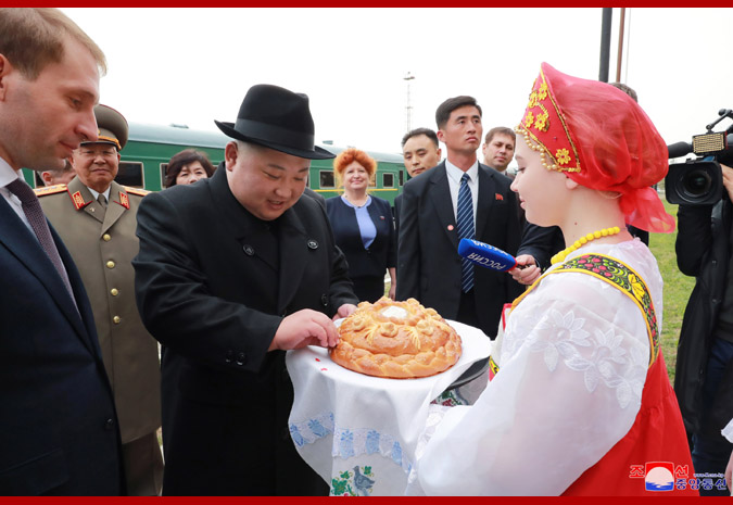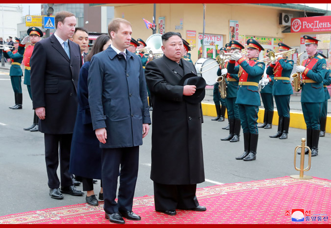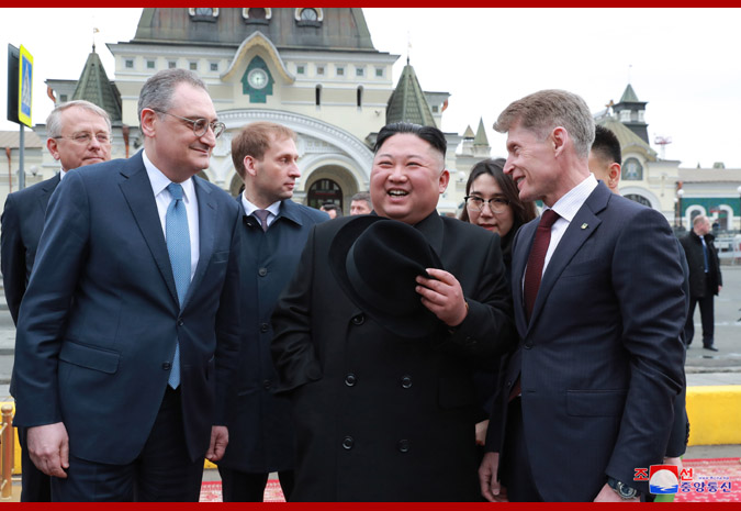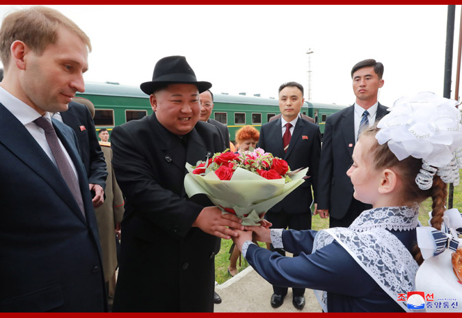 조선로동당 위원장이시며 조선민주주의인민공화국 국무위원회 위원장이시며 조선민주주의인민공화국무력 최고사령관이신 우리 당과 국가,군대의 최고령도자 현지시간으로 18시,경애하는 최고령도자동지께서 타신 전용렬차가 울라지보스또크역구내에 들어섰다. 경애하는 최고령도자동지를 울라지보스또크역에서 로씨야 원동 및 북극발전상 알렉싼드르 꼬즐로브,로씨야외무성 부상 이고리 모르굴로브,연해변강장관 올레그 꼬줴먀꼬,조선주재 로씨야련방 특명전권대사 알렉싼드르 마쩨고라가 영접하였다. 경애하는 최고령도자동지께서 역전광장에 나오시자 로씨야련방무력 륙해공군명예위병대 대장이 영접보고를 드리였다. 우리 나라 애국가와 로씨야련방 국가가 주악되였다. 경애하는 최고령도자동지께서는 로씨야련방무력 륙해공군명예위병대를 사열하시였다. 이어 륙해공군명예위병대의 분렬행진이 있었다. 경애하는 최고령도자동지께서는 영접나온 중앙과 지방의 간부들과 인사를 나누시고 숙소로 향하시였다. 경애하는 최고령도자동지를 안내해드리기 위하여 하싼에 내려온 로씨야 원동 및 북극발전상 알렉싼드르 꼬즐로브를 비롯한 중앙과 지방의 간부들이 하싼역에서 친절히 맞이하였다. 로씨야주재 조선특명전권대사 김형준과 울라지보스또크주재 조선총령사 조석철이 역에서 맞이하였다. 경애하는 최고령도자동지께서는 렬차에서 내리시여 영접나온 중앙과 지방의 간부들과 인사를 나누시였다. 경애하는 최고령도자동지께 로씨야의 녀성들이 풍습대로 빵과 소금을 드리고 꽃다발과 환영의 인사를 올리였다. 경애하는 최고령도자동지께서는 이어 역사의 응접실로 안내되시였다. 로씨야 원동 및 북극발전상 알렉싼드르 꼬즐로브를 비롯한 영접간부들은 뿌찐대통령각하께서 경애하는 최고령도자동지께서는 이에 사의를 표하시고 그들과 따뜻한 담화를 하시였다.