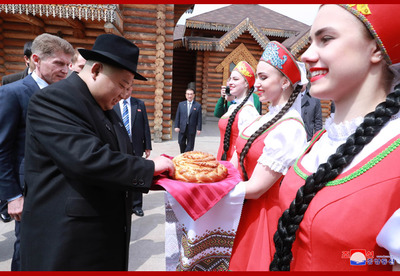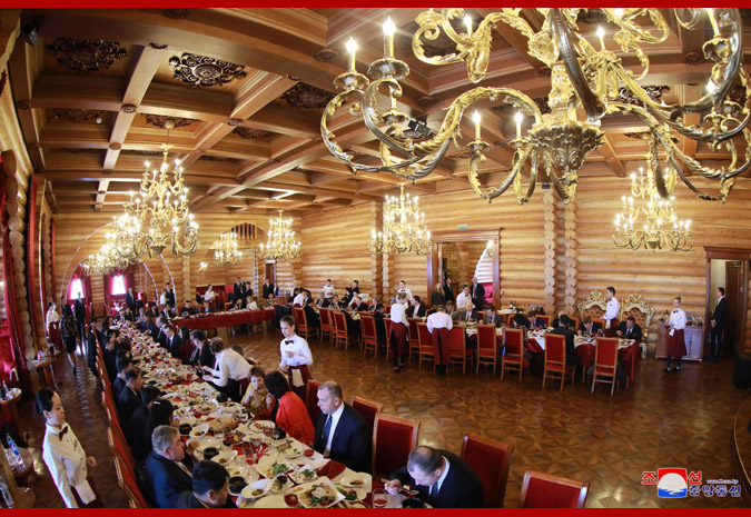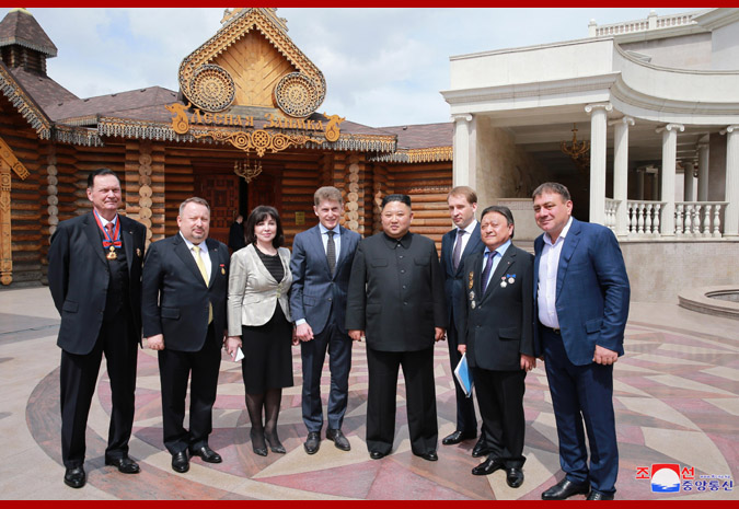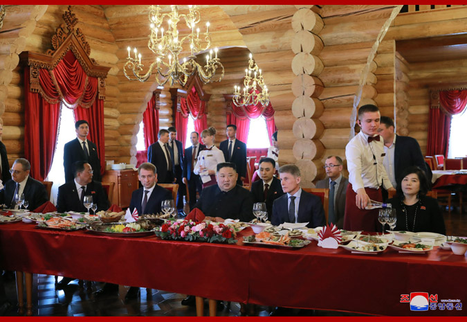 조선로동당 위원장이시며 조선민주주의인민공화국 국무위원회 위원장이시며 조선민주주의인민공화국무력 최고사령관이신 우리 당과 국가,군대의 최고령도자 경애하는 최고령도자동지를 위하여 연해변강장관 올레그 꼬줴먀꼬는 위대한 장군님께서 2002년 8월 원동지역을 방문하시던 나날에 몸소 다녀가신 울라지보스또크시내의 《레스나야 자임까》식당에서 뜻깊은 오찬을 마련하였다. 경애하는 최고령도자동지의 력사적인 로씨야방문을 수행하고있는 당과 정부간부들과 실무일군들이 함께 초대되였다. 로씨야측에서 원동 및 북극발전상 알렉싼드르 꼬즐로브,외무성 부상 이고리 모르굴로브,우리 나라 주재 로씨야특명전권대사 알렉싼드르 마쩨고라,울라지보스또크시장 올레그 구메뉴크를 비롯한 관계일군들이 참가하였다. 경애하는 최고령도자동지께서 도착하시자 화려한 민족의상을 한 아름다운 로씨야녀성들이 전통적인 풍습대로 빵과 소금을 올리며 환영의 인사를 드리였다. 경애하는 최고령도자동지께서는 식당정문에 모셔진 위대한 령도자 경애하는 최고령도자동지께서는 위대한 장군님을 식당에 모시였던 잊지 못할 그날을 감회깊이 돌이켜보며 감격을 금치 못하는 연해변강일군들과 따뜻한 담화를 나누시고 《레스나야 자임까》식당을 배경으로 뜻깊은 기념사진을 찍으시였다. 오찬에서는 연해변강장관 올레그 꼬줴먀꼬와 외무상 리용호동지가 축배사를 하였다. 연설자들은 조로 두 나라 최고령도자들의 심원한 구상과 령도를 높이 받들어 유구한 력사와 전통을 가지고있는 조로친선협조관계를 전략적견지에서 시대적요구에 맞게 계승해나가며 두 나라 인민들의 불패의 친선단결을 더욱 공고발전시켜나갈 확고부동한 의지를 피력하였다. 오찬은 따뜻한 친선의 정이 넘치는 화기애애한 분위기속에서 진행되였다.