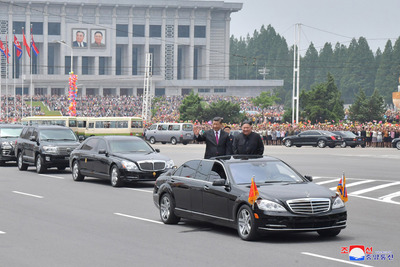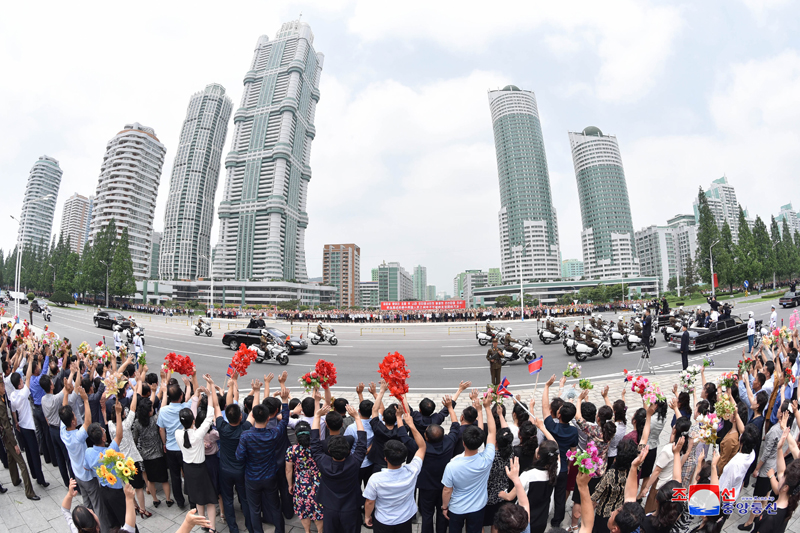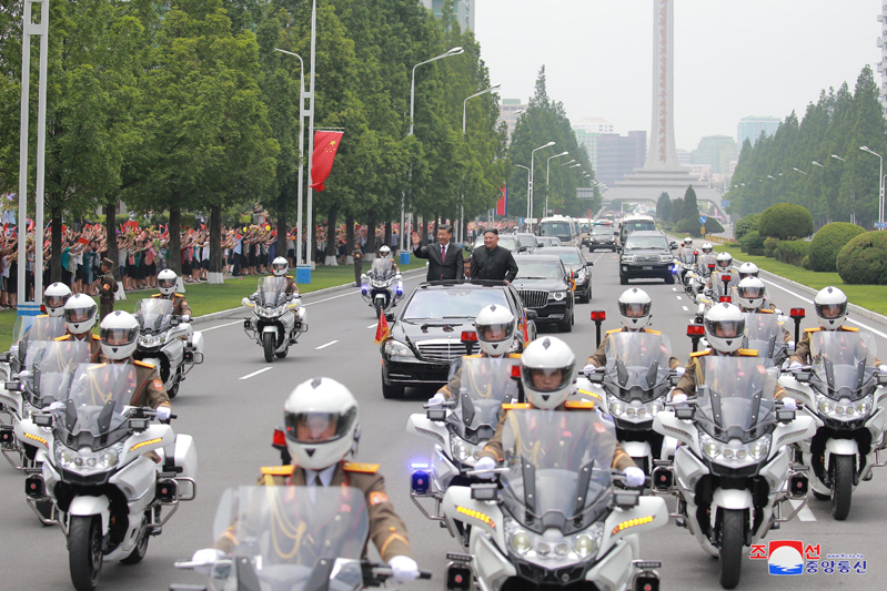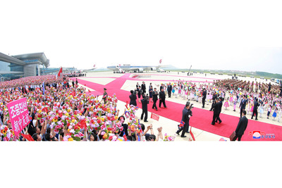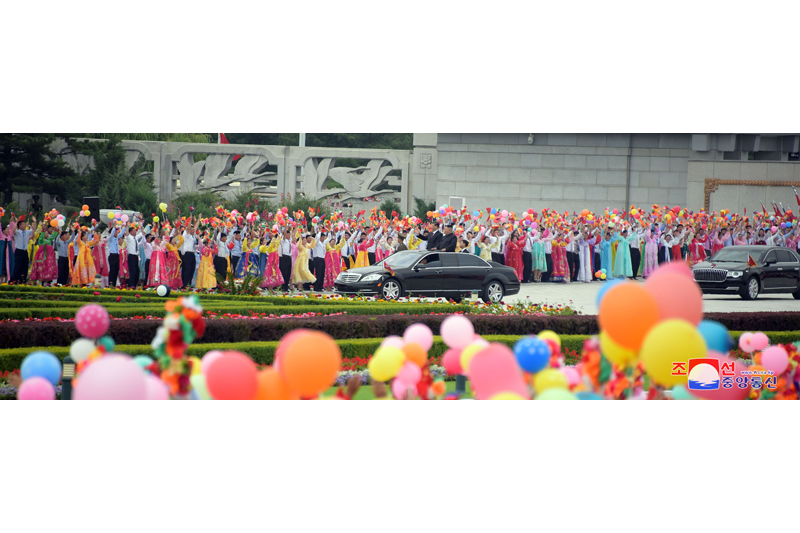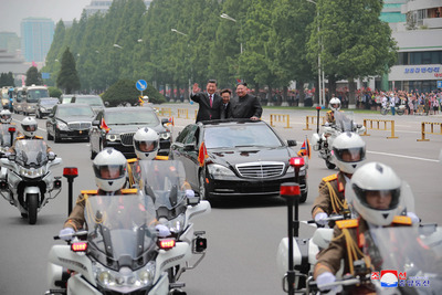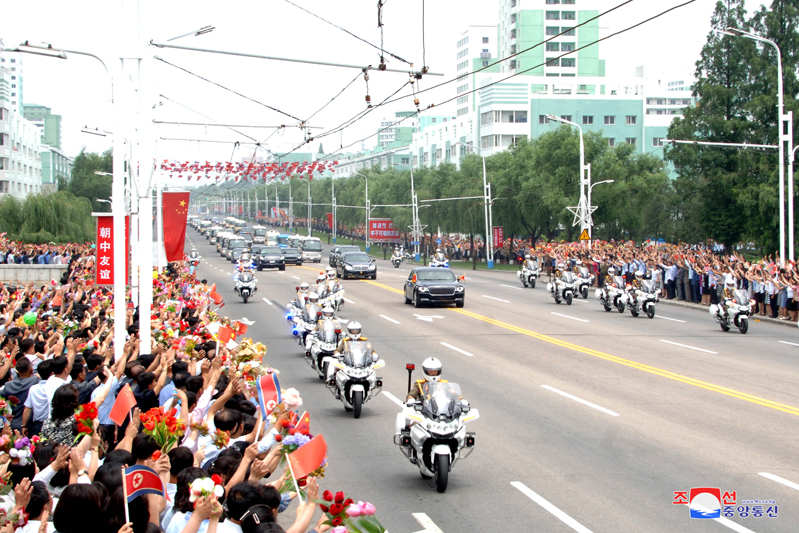 조중최고령도자동지들께서 타신 무개차는 환영의 인파가 설레이는 려명거리를 지나 금수산태양궁전광장에 도착하였다. 조중친선의 고귀한 전통을 마련해주시고 참다운 혁명적의리로 소중히 가꾸어오신 위대한 수령 습근평동지를 조선로동당 중앙위원회 정치국 상무위원회 위원이며 조선민주주의인민공화국 국무위원회 제1부위원장이며 최고인민회의 상임위원회 위원장인 최룡해동지와 조선로동당 중앙위원회 정치국 위원이며 조선민주주의인민공화국 국무위원회 위원이며 내각총리인 김재룡동지를 비롯한 당과 정부의 간부들과 수도의 당,정권기관 책임일군들이 맞이하였다. 차에서 내린 습근평동지와 팽려원녀사에게 녀성예술인들이 꽃다발을 드리였다. 경애하는 최고령도자동지께서는 습근평동지에게 당과 정부의 간부들을 소개하시였다. 《조중친선은 영원하리라》의 주악이 울려퍼지는 광장에 녀성취주악단의 경쾌한 률동연주와 군중들의 화려한 춤바다가 펼쳐졌다. 두 나라 최고령도자동지들께서 타신 차는 손에손에 두 나라 국기와 꽃다발을 든 시민들의 열렬한 환영을 받으며 금수산태양궁전광장을 떠나 숙소인 금수산영빈관에 도착하였다. 금수산영빈관 종업원들이 습근평동지와 팽려원녀사에게 꽃다발을 드리였다. 경애하는 최고령도자동지께서는 리설주녀사와 함께 습근평동지와 팽려원녀사를 숙소로 직접 안내하시고 담소를 나누시였다.
