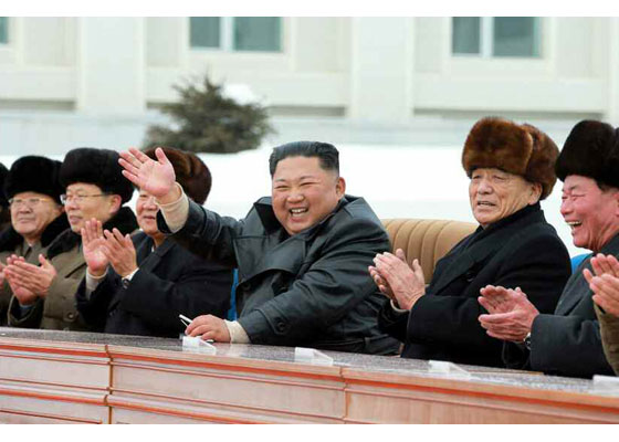 경애하는 최고령도자동지께서는 승리의 보고, 영광의 보고를 올리며 보무당당히 행진해가는 건설자들과 군중들에게 따뜻이 손저어 답례를 보내시였다.