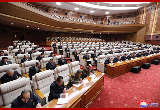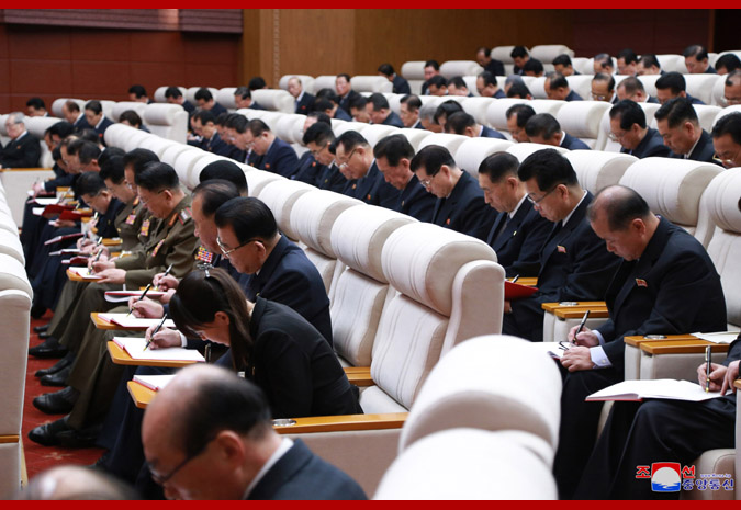 Se refirió a algunos problemas que se presentan en materializar la posición revolucionaria de autoconfianza y sus principios. Ante todo, destacó la necesidad de tener una correcta comprensión sobre el propósito del CC del Partido que presentó como agenda principal del presente pleno el tema de levantar más alto la bandera de apoyarse en las fuerzas propias. Continuó que el espíritu principal del 4º Pleno del Séptimo Período del CC del PTC reside en abrir la etapa de gran auge de la construcción socialista tomando la autoconfianza como remedio de prosperidad y desarrollando con osadía la ofensiva y batalla general de todo el partido, Estado y pueblo, en estos tiempos en que se presenta como principal tarea política la construcción de una potencia económica. Instruyó librar vigorosamente la gran marcha para conquistar las metas de la construcción económica, presentadas en el pleno, de modo que se pueda manifestar cabalmente el ímpetu ofensivo de nuestra patria y transitar con firmeza a la nueva etapa de crecimiento. Volvió a resaltar la importancia del deber y el papel que asumen los funcionarios en trazar la estrategia de autoconfianza y organizar y ejecutar con la visión científica todas las labores. Señaló que las organizaciones partidistas y las otras de masas deben desarrollar intensamente la labor política orientada a llamar a todos los militantes del partido y trabajadores a la gran marcha de autoconfianza con el objetivo de hacer reinar en todo el país el nuevo ambiente revolucionario. Establecer estrictamente el modo de vida socialista deviene el quehacer importante para mantener el carácter jucheano y la nacionalidad en el sector de vida cultural y para preservar el atributo original del socialismo y poner en pleno juego su superioridad, aseveró e indicó las tareas que corresponden a las organizaciones partidistas y funcionarios en la lucha por el respecto. Finalmente, expuso la esperanza y convicción de que todos los funcionarios, militantes del partido y trabajadores alcanzarán exitosamente las metas de lucha definidas en el pleno al emprender con energía la gran marcha de autoconfianza, de manera que se logre nuevo avance en la construcción socialista y se exalte una vez más la gallarda imagen de nuestro Estado que marcha triunfalmente con fuerzas propias.