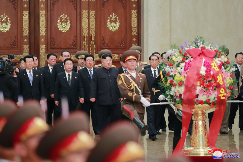 Con motivo del Día del Sol, el Máximo Dirigente Le acompañaron en esta ocasión Choe Ryong Hae, miembro del Presidium del Buró Político del Comité Central del PTC, primer vicepresidente del CE de la RPDC y presidente del Presidium de la APS, Pak Pong Ju, miembro del Presidium del BP del CC del PTC, vicepresidente del CE de la RPDC y vicepresidente del CC del PTC, Kim Jae Ryong, miembro del BP del CC del PTC y del CE de la RPDC y premier y otros miembros del BP del CC del PTC y del CE de la RPDC. El Máximo Dirigente entró en el hall donde se encuentran las estatuas de pie del Presidente y el Dirigente. Fueron colocados ante las estatuas de los líderes coreanos un cesto de flores en nombre del Máximo Dirigente y el otro en nombre común del CC del PTC, la Comisión Militar Central del PTC y el CE de la RPDC. Junto a los participantes en la ceremonia de homenaje, el Máximo Dirigente rindió tributo a los grandes Líderes antecesores ante sus estatuas de pie. Él reiteró homenaje al Presidente y el Dirigente en los salones de eternidad donde están conservados sus cuerpos.