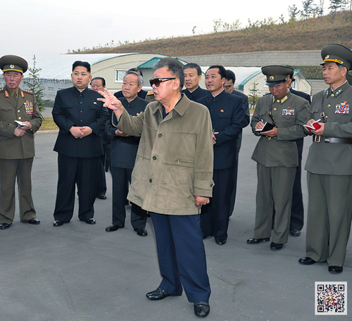 대동강자라공장을 현지지도하시는 위대한 령도자 김정일동지와 경애하는 김정은동지