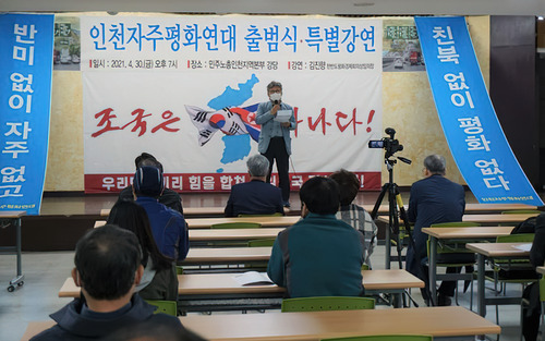 인천자주평화연대 이성재 대표가 민주노총 인천지역본부에서 개최된 출범식에서 대회사를 낭독하고 있다.