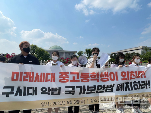 촛불중고생시민연대 중고등학생들이 6일 오후 여의도 국회의사당 앞에서 '국가보안법 폐지'를 위한 기자회견을 열었다.